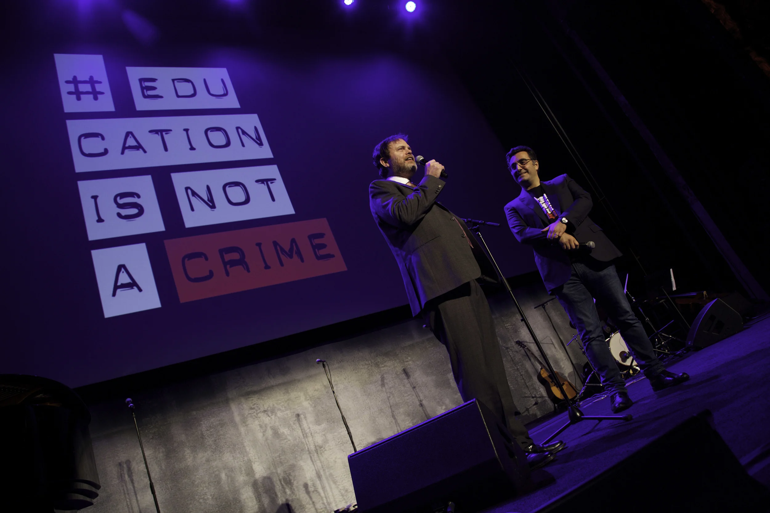 Actor Rainn Wilson with Maziar Bahari at Education is not a Crime Live in LA, February 2015.